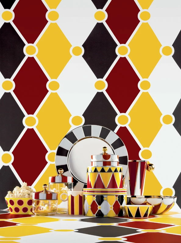 Circus is a playful kitchen and serving collection designed by Marcel Wanders for the Italian design brand Alessi. The collection was inspired by the ambience of old, colourful circus tents, where bright shades of yellow and red combine with strong black and white patterns and the shine of gold and silver. The Circus collection transforms the delightful spirit of old-time circus into a modern shape and fills the table with joyful atmosphere.