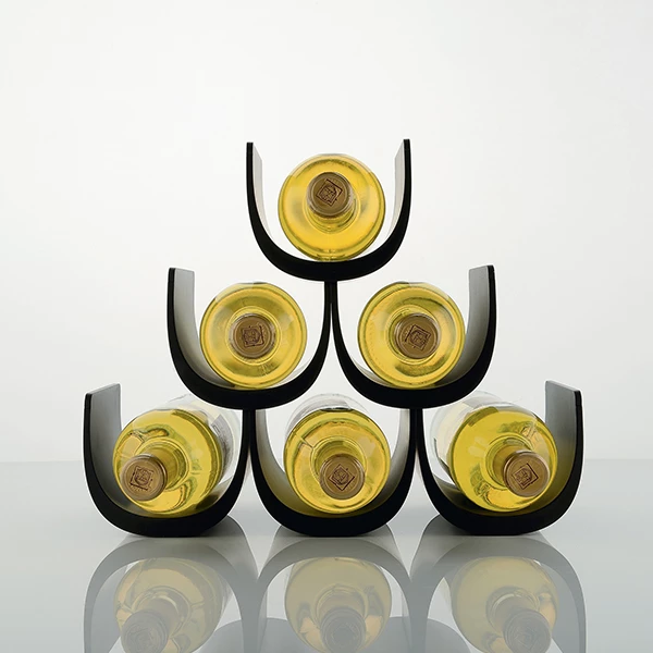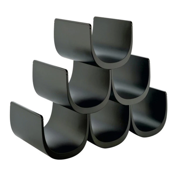 Noe wine bottle holder, designed by Giulio Iacchetti for Alessi, fits up to six bottles of wine or champagne. The wine bottle holder is made of black plastic, and it arranges the bottles into a shape of a triangle.