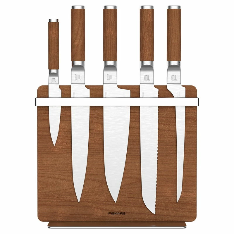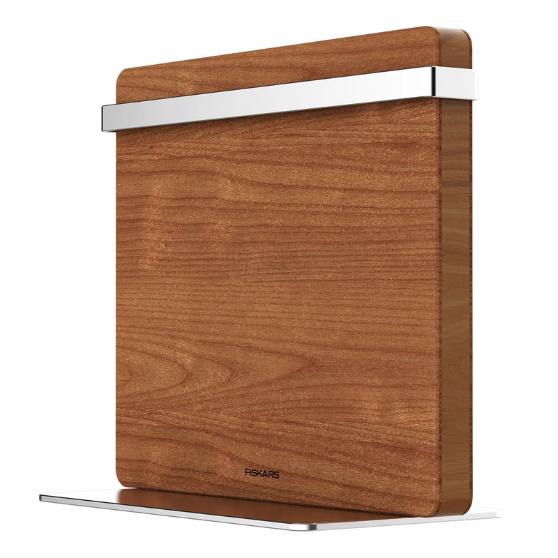 Premium knife block by Fiskars keeps the kitchen knives always easily reachable in an elegant manner. The knife holder is made of heat-treated birch and magnetic metal that holds the knives safely. The knife block can be mounted on the wall orΒ placed on the tableΒ on its metal base.Β